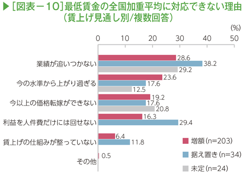 【賃上げ見通し別】 賃上げ見通し別でみても「業績が追いつかない」が最も高いが、特に「据え置き」とした企業ではその傾向がより強い。また、「据え置き」の企業では「利益を人件費だけには回せない」の割合も高く、限られた利益の中から人件費の原資を捻出する難しさが賃上げ判断にも影響した結果と考える(図表-10)。