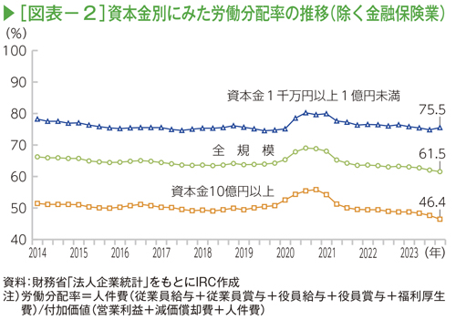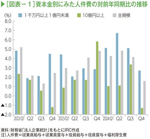 財務省「法人企業統計」をもとに、賃上げが本格化し始めた2022年以降の人件費(従業員給与+役員給与+福利厚生費)推移を資本金別でみると、対前年比は「1千万円以上1億円未満」(以下「中小企業」)が「10億円以上」(以下「大企業」)を上回っており、特に2024年はより顕著である(図表-1)。