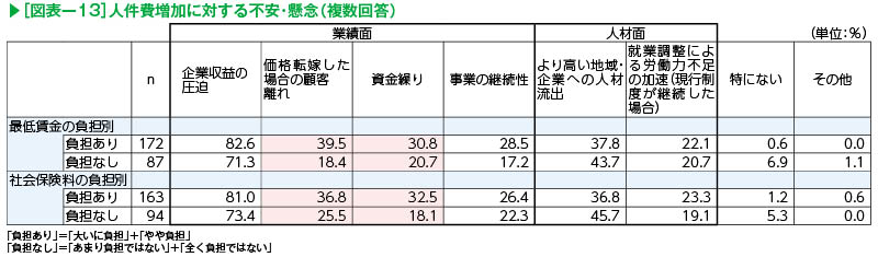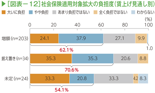 【賃上げ見通し別】 賃上げ見通し別では、「据え置き」予定の企業で「負担あり」との回答が70.6%となり、全体(62.4%)を上回る。賃金を据え置かざるを得ない要因として、最低賃金の動向に加え社会保険料の負担も影響しているようだ(図表-12)。