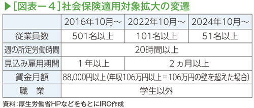近年、社会保障制度の財政悪化が深刻化しており、制度の持続可能性が課題となっている。そこで、働く人の負担を分散し、制度の安定性を確保するために、社会保険適用対象の拡大が検討・実施されてきた。直近では、2024年10月から従業員数51名以上の事業所に拡大されている(図表-4)。