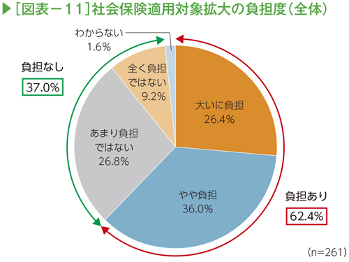 【全体】 全体の62.4%が「負担あり」と回答し、「負担なし」は37.0%となった(図表-11)。社会保険料の増加も企業にとって大きな負担となっている。