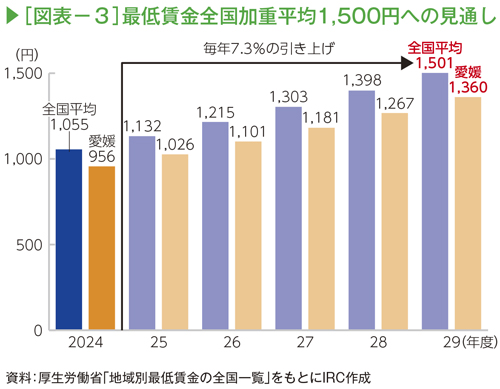 2024年の最低賃金の全国加重平均1,055円を2029年に1,500円とするためには、今後5年間の平均引き上げ率を7.3%程度にする必要がある。愛媛は、2024年の改正で対前年比6.58%増と時給表示に統一された2002年以降で最大の引き上げ幅を記録したが、それ以上の引き上げを続けることになる。仮に、対前年比7.3%増を5年間続けた場合、2029年の愛媛の最低賃金は1,360円となる見込みである(図表-3)。