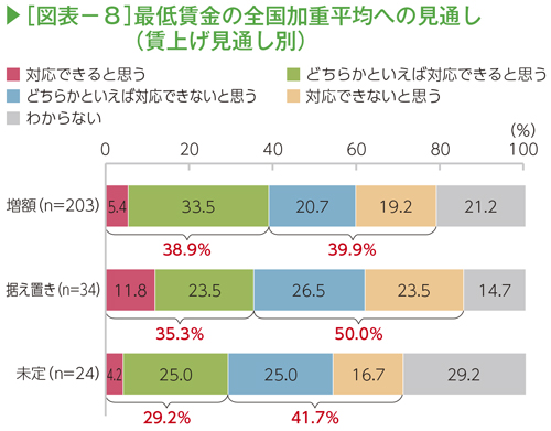 【賃上げ見通し別】 賃上げ見通し別でみると、「据え置き」「未定」とした企業ほど「対応できる」の割合に低下傾向がみられた。定例給与と最低賃金がともに上昇していくことの厳しさがうかがえ、今後の継続性が懸念される(図表-8)。