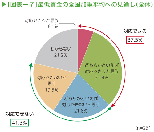 【全体】 全体の41.3%が「対応できない」(「どちらかといえば対応できないと思う」+「対応できないと思う」、以下同)と回答した一方、「対応できる」(「対応できると思う」+「どちらかといえば対応できると思う」、以下同)は37.5%と大きな差はみられなかった(図表-7)。