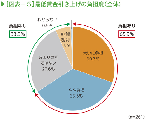 【全体】 足元で続く最低賃金の大幅な引き上げについて、全体の65.9%が「負担あり」(「大いに負担」+「やや負担」、以下同)と回答し、「負担なし」(「あまり負担ではない」+「全く負担ではない」、以下同)は33.3%にとどまる(図表-5)。