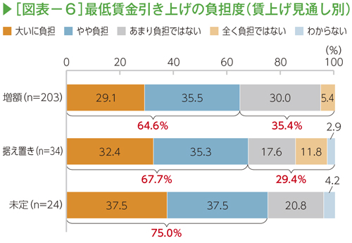 【賃上げ見通し別】 2025年度賃上げ見通し別にみると、「増額」(賃上げ)予定の企業は「負担なし」の割合が35.4%と比較的高くなった。一方で、「据え置き」「未定」とした企業ほど「負担あり」の割合が高くなる傾向がみられ、賃上げへの息切れ感がうかがえる(図表-6)。