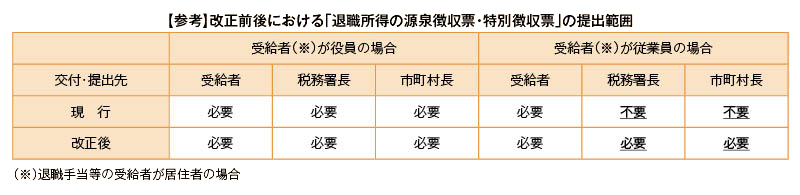 現行は、退職手当等の支払者である会社が、「退職所得の源泉徴収票・特別徴収票」を税務署長と市町村長に提出する必要があり、その対象者は、受給者(居住者)が“役員”の場合のみとなっています(この場合の役員には相談役、顧問その他これらに類する方が含まれます)。