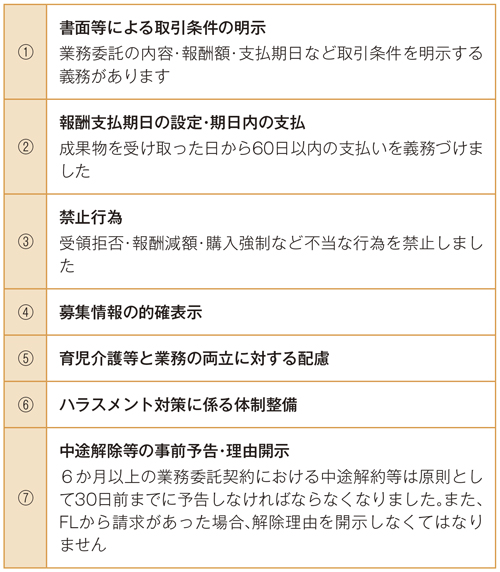 この背景には「個人」として業務委託を受けるFLと「組織」として業務委託を行う発注事業者との力関係が影響していると考えられます。こうした環境を改善するために労働基準法上での労働者に該当しないFLを保護する法律が制定されました。