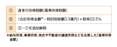 「特定の基準所得金額の課税の特例」では、個人のその年分の基準所得金額が3億3,000万円を超えるものについては、その超える部分の金額の22.5%に相当する金額からその年分の基準所得税額を控除した金額に所得税が課されます。(下図参照)
