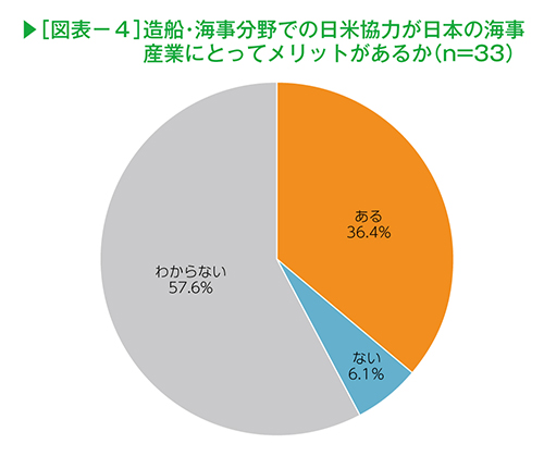 造船・海事分野での日米協力が日本の海事産業にとってメリットがあるかどうか尋ねたところ、「ある」が12先(36.4%)、「ない」が2先(6.1%)、「わからない」が19先(57.6%)だった(図表−4)。