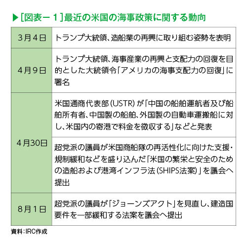 トランプ大統領は4月、米国の海事産業基盤を再興するための大統領令に署名し、自国の造船産業への支援策のほか、日本や韓国など、同盟国の造船業者による米国への投資を促進する施策などを検討するよう指示した。なお、米国の造船業の振興については、政府・議会超党派ともに方向性が一致している(図表−1)。