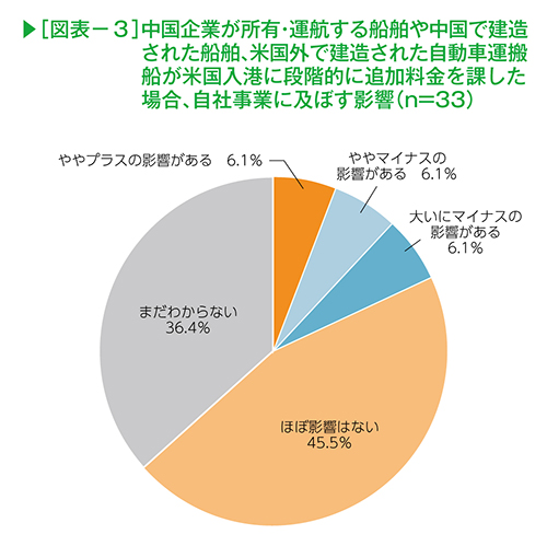 中国企業が所有・運航する船舶、中国で建造された船舶、米国外で建造された自動車運搬船の米国入港に段階的に追加料金を課した場合に自社事業に及ぼす影響について尋ねたところ、「ほぼ影響はない」が15先(45.5%)、「まだわからない」が12先(36.4%)だった(図表−3)。
