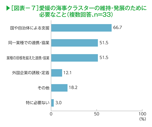 その結果、「国や自治体による支援」が22先(66.7%)で最も多かった。次いで、「同一業種での連携・協業」と「業種の垣根を越えた連携・協業」がそれぞれ17先(51.5%)などとなった(図表−7)。