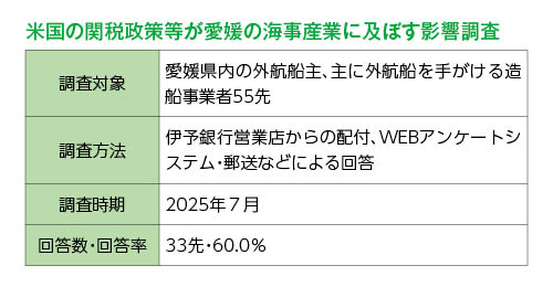 県内の外航船主と外航船の新造を手がける造船会社を対象に、米国の関税政策や海事産業の振興策などが及ぼす影響についてアンケートで尋ねた。調査の概要は以下のとおり。
