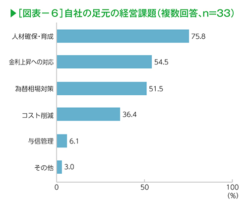 自社の足元の経営課題について尋ねたところ、「人材確保・育成」が25先(75.8 %)で最も多かった(図表−6)。次いで、「金利上昇への対応」(18先・54.5%)、「為替相場対策」(17先・51.5%)、「コスト削減」(12先・36.4%)などとなった。