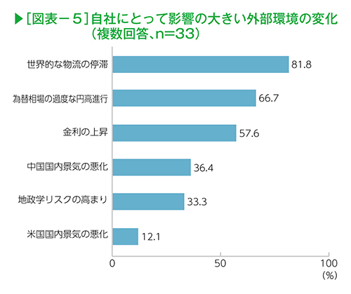 では、自社にとって影響の大きい外部環境の変化は何なのかを尋ねたところ、「世界的な物流の停滞」が27先(81.8%)で最も多かった(図表−5)。次いで、「為替相場の過度な円高進行」(22先・66.7%)、「金利の上昇」(19先・57.6%)、「中国国内景気の悪化」(12先・36.4%)、「地政学リスクの高まり」(11先・33.3%)などとなった。