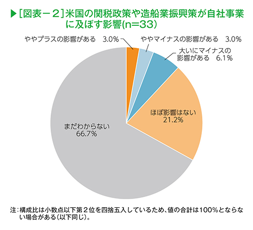 米国の関税政策や造船業振興策が自社事業に及ぼす影響について尋ねたところ、「まだわからない」が22先(66.7%)、「ほぼ影響はない」が7先(21.2%)で多数を占めた。理由として多くの船主から「政策の先行きが不透明」「長期傭船主体でほぼ影響はない」「トランプ氏が退任するまで、あと3年は辛抱」などの意見が聞かれた(図表−2)。