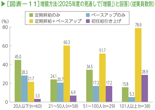 従業員数別では、企業規模が大きくなるほど「定期昇給+ベースアップ」の割合が高く、「101人以上」では8割近くを占める。一方、「20人以下」では「定期昇給のみ」が45.0%と最も高くなった(図表-11)。また、全体では11.9%だった「初任給の引き上げ」は、「101人以上」で28.9%と高く、大手企業との新卒者採用競争の激しさがうかがえる。