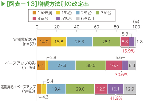 なお、増額方法別に賃上げ率をみると、積極姿勢が強まるにつれて高めとなり、「定期昇給+ベースアップ」では「4%台」以上が41.9%となった(図表-13)。