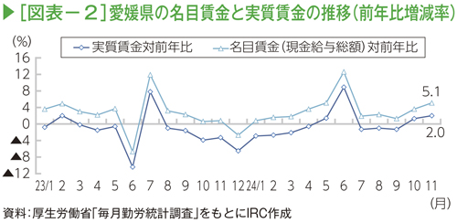 愛媛の賃金推移をみると、名目賃金は2024年以降、対前年比プラスが続いており、賃上げの影響がみられる。一方で実質賃金は、直近2024年11月調査で2ヵ月連続のプラスとなったものの、賞与や最低賃金改正のタイミングによる一時的なものと考えられ、依然としてプラス圏での推移は定着していない(図表-2)。