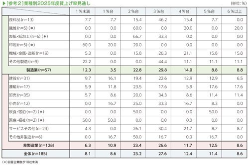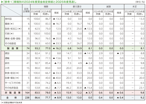業種別に具体的な賃上げ実施割合をみると、製造業では、回答企業数は限られるが「製紙・紙加工」「印刷」は2024年度実績を上回る一方、その他の業種では実績を下回った(11ページ[参考1])。加工する原材料代やエネルギーコストの高止まりの影響から、「据え置き」を見込む企業が増加した。