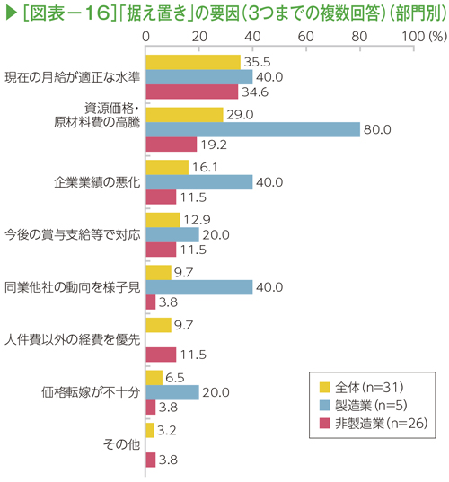 今年度の見通しを「据え置き」と回答した要因について、全体では「現在の月給が適正な水準」が35.5%と最も高く、次いで「資源価格・原材料費の高騰」(29.0%)が続く(図表-16)。