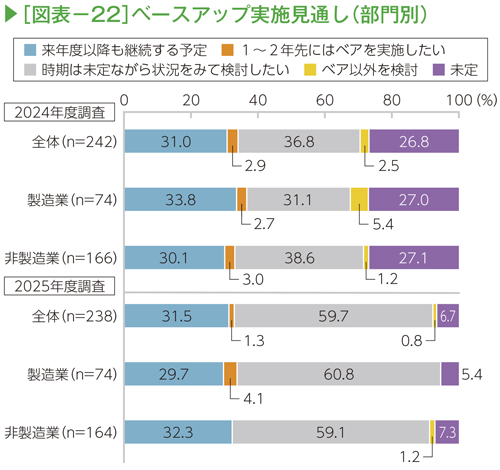 全体では、「来年度以降も継続する予定」と回答した割合は31.5%と前年調査(31.0%)と同水準になり、賃上げ機運は維持されている(図表-22)。また、現時点で「未定」とした企業は前年調査比で大きく低下する一方、「時期は未定ながら状況をみて検討したい」が20ポイント以上伸びており、持続的な賃上げに向けた意識変化がみられる。