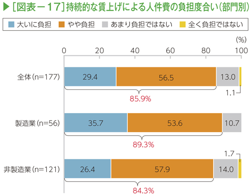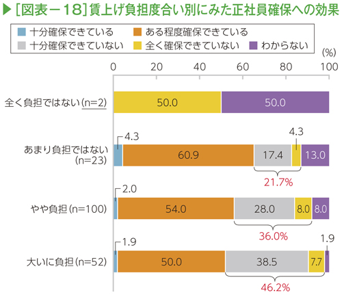 回答企業数が極端に少ない「全く負担ではない」を除くと、約5割はある程度確保できている。一方で、負担度合いが高くなるほど確保できていない(「十分確保できていない」+「全く確保できていない」)割合が高く、負担や効果にかかわらず賃上げせざるを得ない実態がうかがえる(図表-18)。