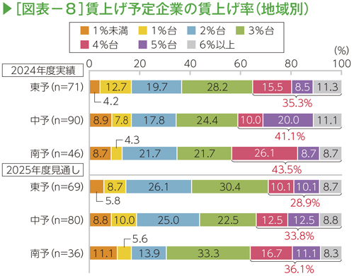 東予と南予は「3%台」が約3割で最も高く、中予は「2%台」(25.0%)が最も高い(図表-8)。また、すべての地域で「4%台」以上の割合が2024年度実績比で低下した。