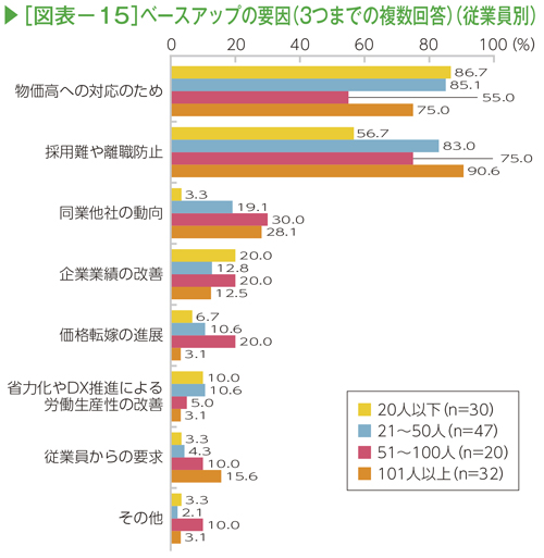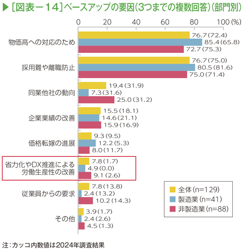 全体では、「物価高への対応のため」と「採用難や離職防止」が76.7%となり、「企業業績の改善」(15.5%)や「価格転嫁の進展」(9.3%)、「省力化やDX推進による労働生産性の改善(以下「労働生産性の改善」)」(7.8%)を大きく上回る(図表-14)。業績改善要因より防衛的要因が強いベースアップだが、「労働生産性の改善」は前年調査(1.7%)から伸びている。