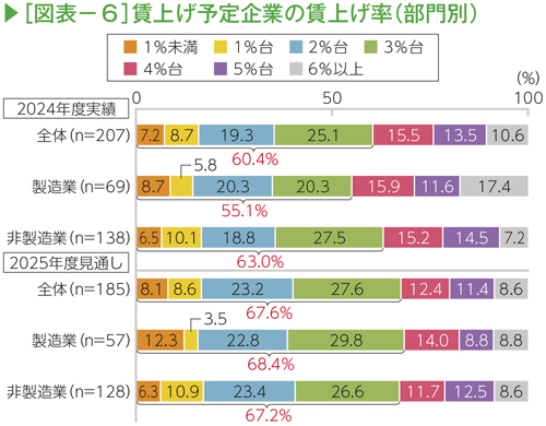 全体では「3%台」が27.6%で最も高く、次いで「2%台」(23.2%)が続く(図表-6)。また、「1%未満」から「3%台」までの割合が67.6%と2024年度(60.4%)より上昇した。一方、今春闘で連合が中小組合の目標として掲げる「6%以上」は8.6%にとどまった。部門別でも、同様の傾向がみられた。