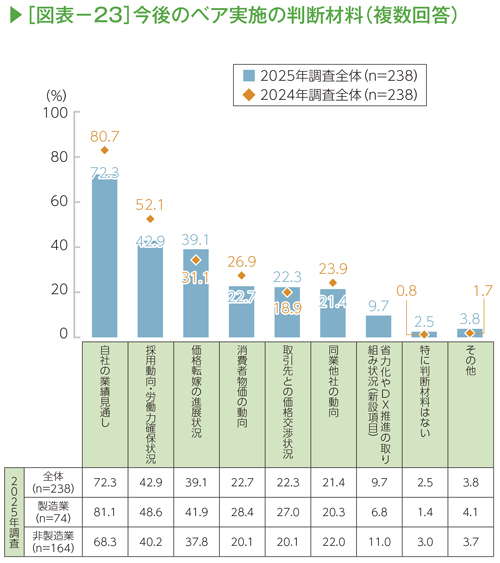 全体では、「自社の業績見通し」が72.3%と最も高く、次いで「採用動向・労働力確保状況」が42.9%で続くが、それぞれの割合は前年調査より低下している(図表-23)。一方、「価格転嫁の進展状況」(39.1%)は前年調査(31.1%)を上回り、人件費増加分の価格転嫁に対する意識変化がみられた。