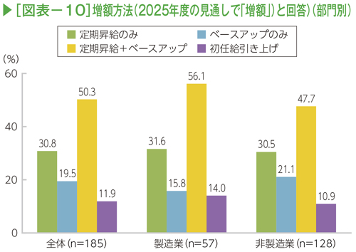 賃上げ予定企業の具体的な増額方法について、全体では最も積極的な賃上げである「定期昇給+ベースアップ」(50.3%)が最も高く、「ベースアップのみ」と合計すると、約7割の企業がベースアップを予定している(図表-10)。