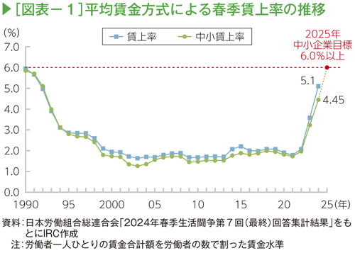 2024年春闘の賃上げ率は、日本労働組合総連合会(以下「連合」)の集計によると、全体では5.1%と目標であった「5%以上」を達成したが、中小組合に限ると4.45%にとどまった。(図表-1)。賃上げの裾野を広げ、消費を拡大するには中小企業への波及が課題であることから、連合は2025年春闘での要求水準を全体では「5%以上」とするなか、中小企業は「6%以上」を目標としている。経済諸団体トップもこうした方針を理解し、大手企業を中心に先行して高い賃上げ率を掲げている。