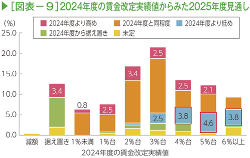2025年度の賃上げスタンスを2024年度実績の賃上げ率別にみると、「据え置き」から「3%台」までは「同程度」または「高め」とする企業が比較的多く、賃上げ意識の広がりがみられる。一方、2024年度実績が「4%台」以上だった企業では、2025年度は「低め」を見込む企業が比較的多く、高い賃上げ率を継続する難しさがうかがえる(図表-9)。