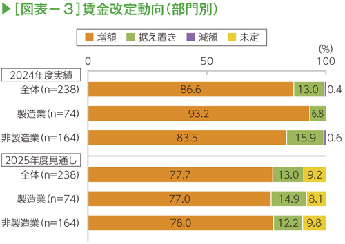 部門別では、製造業、非製造業ともに約8割が賃上げ実施を予定する。また、製造業では「据え置き」(14.9%)が2024年度実績(6.8%)を大きく上回った。