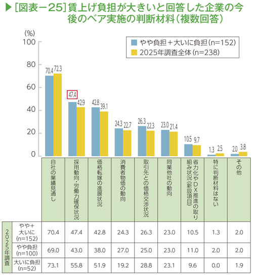 賃上げ負担が大きい(「やや負担」+「大いに負担」)と回答した企業では、「採用動向・労働力確保状況」(47.4%)が全体(42.9%)を約5ポイント上回り、差が最も大きかった(図表-25)。