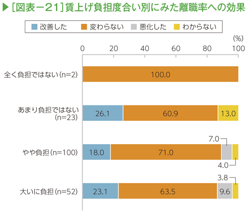 離職率への効果については、「改善した」との回答は2割前後にとどまり、負担度合いが高い企業では「悪化」したとの回答もみられた(図表-21)。賃上げ要因に「離職防止」を挙げる企業が多いなか、賃上げ競争がより高い企業・地域への人材流出につながっているケースが考えられる。人員不足に悩む多くの企業が賃上げに取り組む今、賃上げだけでは問題の解決に不十分である。人材確保を目指す企業には、柔軟かつ多様な働き方の導入や労働環境の改善、省力化とDX推進による生産性向上のほか、成長機会の提供によるモチベーション向上など、賃金面以外での取り組みが求められる。