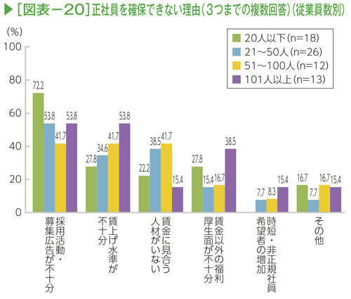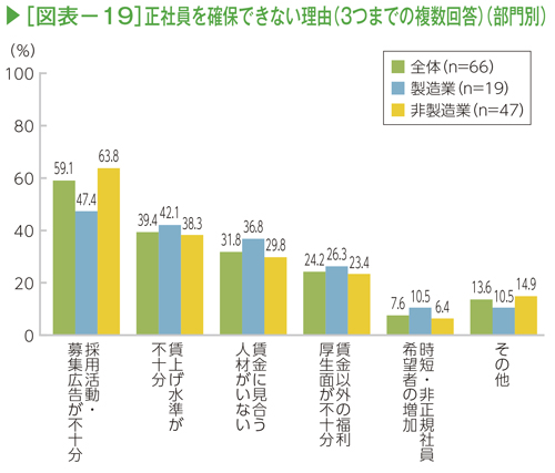 「十分確保できていない」または「全く確保できていない」と回答した企業に対して、その理由を尋ねたところ、「採用活動・募集広告が不十分」が最も高く、特に非製造業で顕著である(図表-19)。ある製造業者からは、「そもそも応募がない」という切実な声が聞かれた。