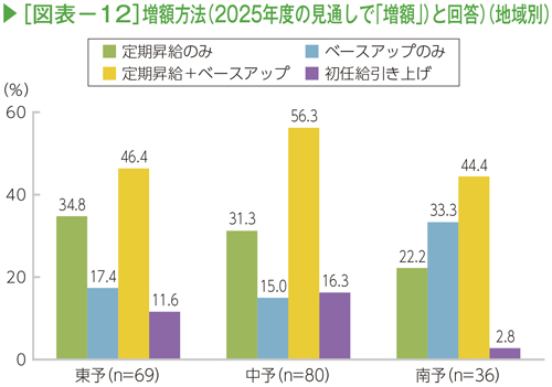 すべての地域で「定期昇給+ベースアップ」の割合が最も高く、地域差はみられなかった。そのなかで南予は、「ベースアップのみ」が33.3%と他地域を大きく上回っている。南予は、回答企業に占める「20人以下」の割合が約5割と東・中予の約3割に比べて高いことから、昇給制度による賃上げよりも経営者の判断によるベースアップの方が取り組みやすいものと考える(図表-12)。