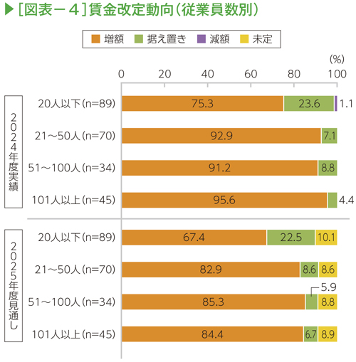 従業員数別では、2024年度実績と同様に企業規模が大きいほど賃上げ予定の割合が高くなる傾向があり、「20人以下」を除いて約8割となった(図表-4)。「20人以下」の小規模事業者では、約7割が賃上げ予定の一方で約2割は「据え置き」としている。小規模製造業者からは、「賃上げしやすいように国の景気そのものを良くして欲しい」という意見や、地方と大都市との差を指摘する声が聞かれた。