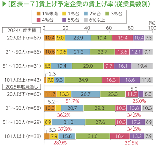 従業員規模が小さいほど「2%台」までの割合が高くなる一方、企業規模が大きくなるにつれて「4%台」以上の割合が高まる傾向がみられた(図表-7)。