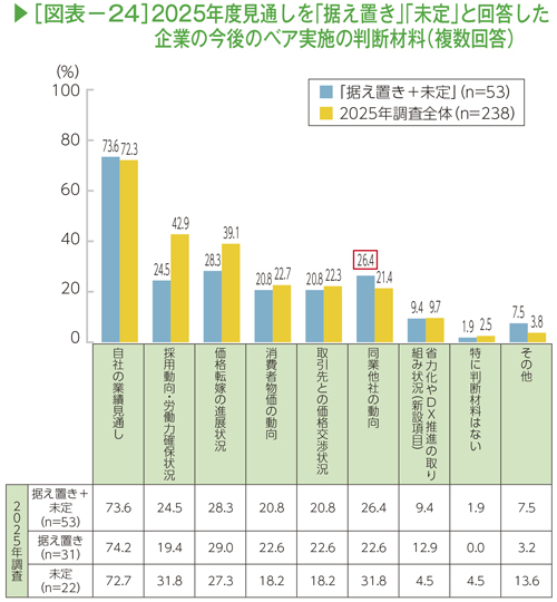 2025年度見通しを「据え置き」「未定」とした企業の判断材料をみると、「同業他社の動向」(26.4%)が全体(21.4%)を5ポイント上回り、様子見姿勢がうかがえる(図表-24)。