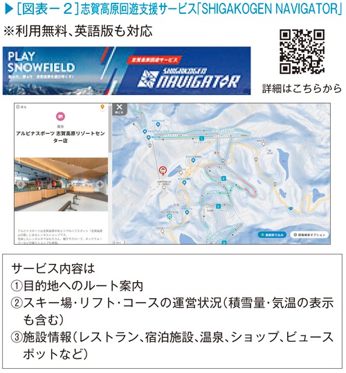 24年12月からは志賀高原回遊支援サービス「SHIGAKOGEN NAVIGATOR(図表−2)」を開始した。これにより、デジタルマップ上で施設情報(レストラン、宿泊施設、温泉、ショップなど)に加え、リフト運行状況やゲレンデ情報がリアルタイムで把握できるほか、目的地までの最適なルート案内を受けることができる。「志賀高原ファン」にとって、広大な志賀高原を存分に楽しめ、新たな魅力や価値を再発見するための欠かせないサービスとなっている。