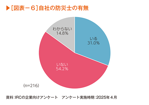 本誌8月号に掲載した「県内企業のBCPの策定・取組状況」では、県内企業のBCP策定率が34.1%にとどまることを踏まえ、策定・運用を進めるためのポイントなどをお伝えした。そのなかで、自社に防災士が「いる」と回答した企業は約3割にとどまっている(図表-6)。