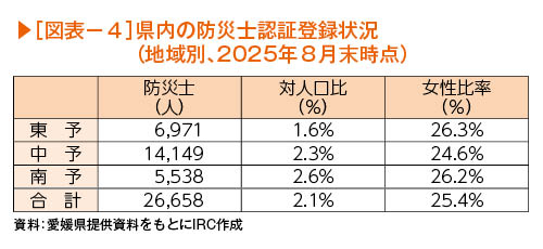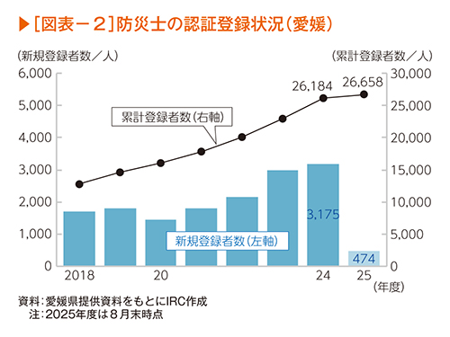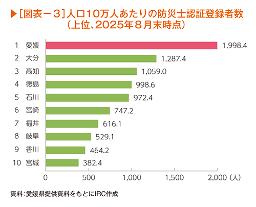 防災士の人口対比は全国1位で(図表-3)、登録総数も人口が約10倍の東京と双璧をなす。昨年9月には松山市の登録者数が全国の市区町村で初めて1万人を超えている。