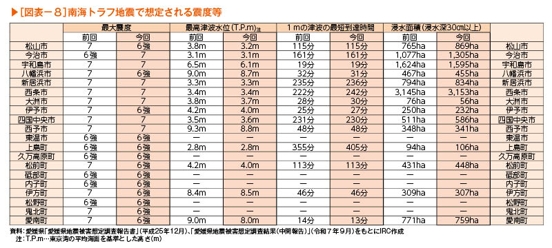 県が9月に公表した地震被害想定調査結果(中間報告)は図表-8のとおりで、地形データの高精度化などで浸水面積が10年前の調査に比べ拡大している地域もある。災害の被害を最小限に抑えるには、先に述べた「自助」「共助」に加えて「協働」が重要となる一方、地域特性(住民数・年齢構成、用途地域)、災害の種類(地震、ゲリラ豪雨)、発生時期・時間(季節、昼夜)などにより対応は大きく異なるという問題も抱えている。現時点での「協働」の取組みは狭い範囲にとどまっており、専門的な知識を有する防災士をいかに活かすかが課題であろう。