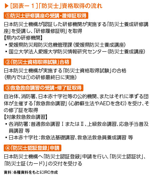この背景には、自治体の危機感がある。災害が起こった際、人員や装備が限られる消防署などだけでは全体をカバーすることができないため、初動段階で期待されるのは「自助」と「共助」である。そこで自治体は、防災に関する一定以上の知識を持った人材「防災士」の育成に着目した。資格取得に必要な費用(研修受講、受験料、教本代など)を全額公費で補助する制度を2005年度に松山市が全国で初めて導入し、その後県内全体に広がった。