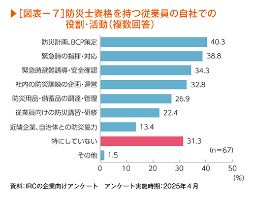 また、自社に防災士が「いる」と回答した企業に対し、防災士が社内でどんな役割・活動を担っているか尋ねたところ、「特にしていない」とする回答が約3割を占めており、企業における防災士のさらなる活動強化が課題と言える(図表-7)。