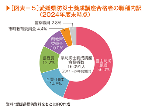 南海トラフ地震の発生が予想されるなか、愛媛県は全国トップの数の防災士を有している。これは県民約50人に1人の割合で防災士がいる計算となり、災害への対応力を備えていると言える。しかし、「自助」「共助」「協働」の観点からみると、防災士のスキルアップ、地域や企業における防災士の活用、防災士を軸とした地域間の連携など、それぞれに課題と対策が見えてくる。